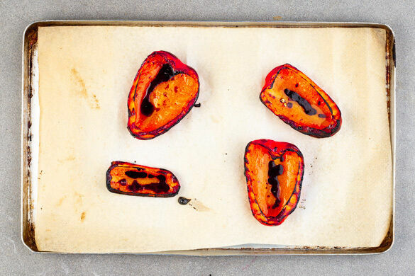 Die Paprika mit der Schnittseite nach oben auf einem mit Backpapier ausgelegten Backblech verteilen und mit der Balsamicocreme sowie 1EL Pflanzenöl beträufeln, mit 1 kräftigen Prise Salz würzen und im Ofen unter dem Grill ca. 10Min. rösten, bis die Haut anfängt, Blasen zu werfen.