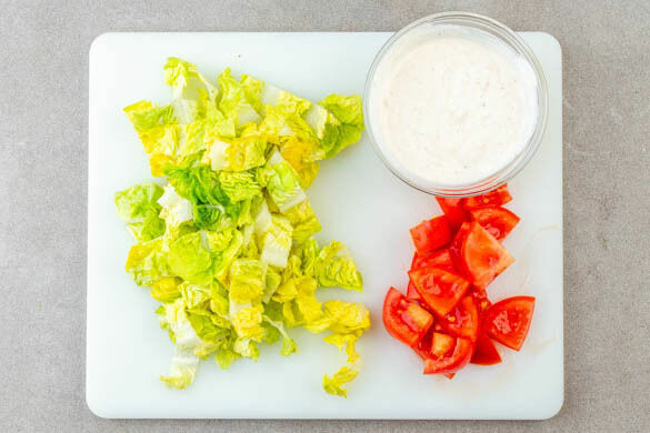 Den Knoblauch schälen und sehr fein würfeln oder durch eine Knoblauchpresse drücken. Den Joghurt mit dem Knoblauch sowie je 1 kräftigen Prise Gewürzmischung, Salz und Pfeffer vermengen, dabei ggf. mit mehr Gewürzmischung, Salz und Pfeffer nachwürzen. Die Tomaten grob würfeln und mit 1 kräftigen Prise Salz vermengen. Den Romanasalat in ca. 2cm breite Streifen schneiden.