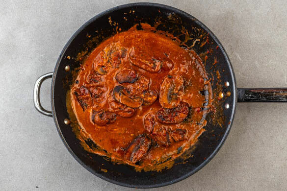 Das Tomatenmark und die restliche Gewürzmischung zu den Pilzen geben und ca. 2Min. mitbraten, dann 2EL Mehl einrühren.