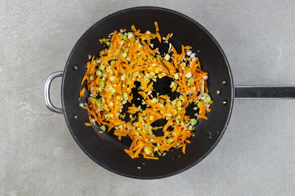 Die Zwiebeln, die Karotten und den Sellerie bei mittlerer Hitze 3–4Min. in der Pfanne braten, bis das Gemüse weich ist. Den Knoblauch und 1 kräftige Prise Salz dazugeben und ca. 1Min. mitbraten.
