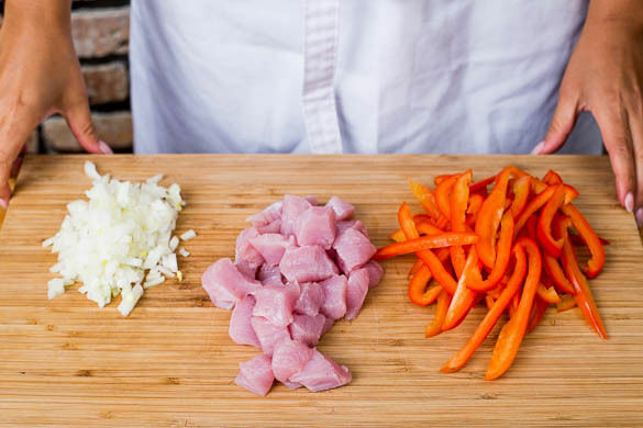 Inzwischen die Paprika vierteln, entkernen und in dünne Streifen schneiden. Die Zwiebel schälen, halbieren und in feine Würfel schneiden. Das Fleisch trocken tupfen und in ca. 2cm große Würfel scheiden.