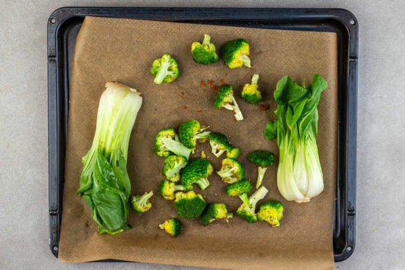 Den Brokkoli auf einem mit Backpapier ausgelegten Backblech mit 1EL Pflanzenöl, dem restlichen Ingwer und 1 Prise Salz vermengen und ca. 10Min. im Ofen backen.