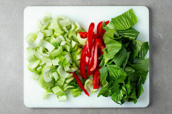 Die Paprika vierteln, entkernen und in dünne Streifen schneiden. Den weißen Teil des Pak Choi in ca. 1cm breite Streifen, den grünen Teil in 2–3cm breite Streifen schneiden.