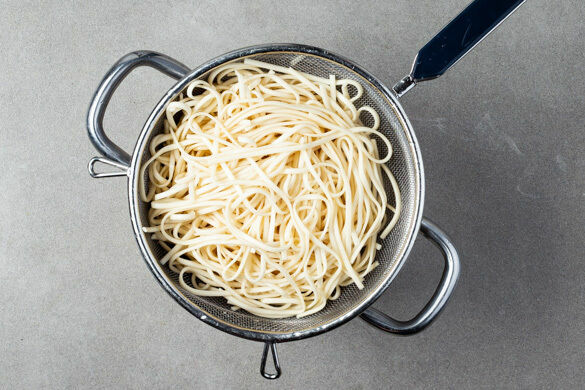 Die Nudeln in das kochende Wasser geben und in 4–6Min. bissfest kochen. In ein Sieb abgießen und kalt abschrecken.