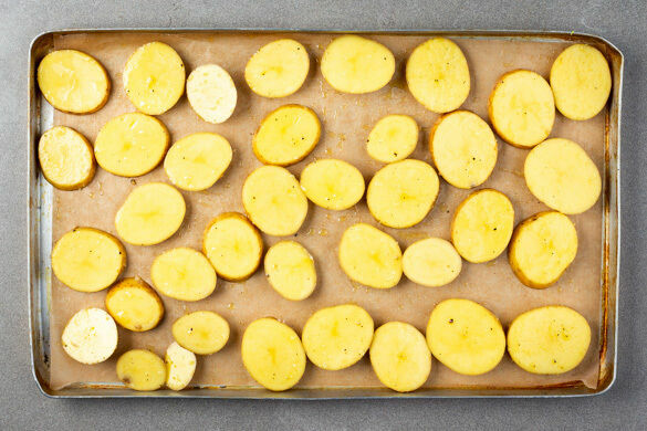 Die Kartoffeln samt Schale in ca. 1cm dicke Scheiben schneiden, mit 2EL Pflanzenöl und je 1 kräftigen Prise Salz und Pfeffer vermengen. Auf einem mit Backpapier ausgelegten Backblech verteilen und im Ofen 20–25Min. rösten, bis die Kartoffeln knusprig und goldbraun sind.
