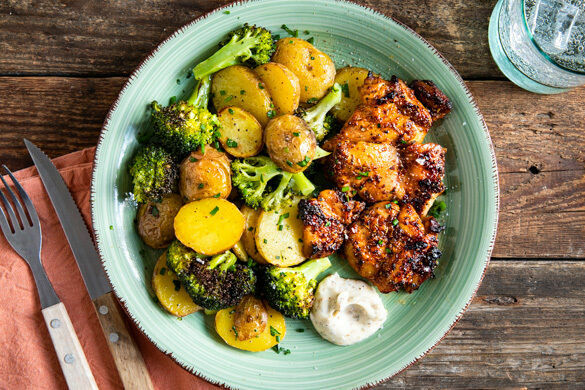 Heute in deiner Box: zartes Hähnchenfleisch aus dem Schenkel, glasiert mit einer würzig-süßen Sriracha-Marinade. Dazu gibt es einen aromatischen Dip, gebackenen Brokkoli und goldbraune Röstkartoffeln mit Petersilie, Schnittlauch und Zitrone. Das Leben kann so schön sein!