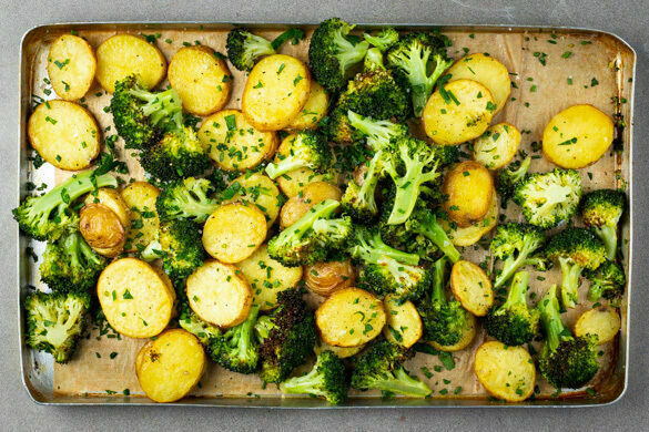 Den Brokkoli mit dem Zitronensaft, 2EL Pflanzenöl sowie je ½TL Salz und Pfeffer vermengen. Auf das Backblech mit den Kartoffeln geben, 10–12Min. bevor diese gar sind, und mitbacken. Tipp: Je nach Größe des Blechs ggf. ein zweites Backblech verwenden.
