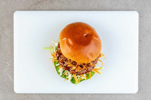 Es ist mal wieder an der Zeit für Fast Food der besonderen Sorte: Heute gönnst du dir einen Turbo-Burger mit krossen Röstzwiebeln, cremigem Slaw mit Würzkick – und natürlich einem saftigen „Rindfleisch“-Patty! Das vegane Patty darf sich noch fein in Teriyakisauce kleiden, bevor es elegant auf dem Brötchenbett Platz nimmt. Dazu servierst du einen erfrischenden Salat mit Hoisin-Dressing. Schnell, lecker, Lieblingsgericht!