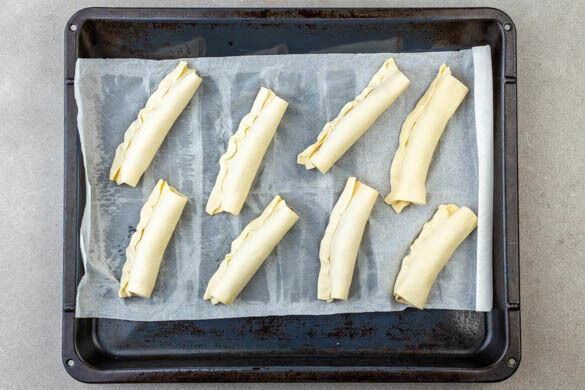 Die Teige mit dem Papier nach unten auf zwei Backblechen ausrollen und jeweils in 8 Rechtecke schneiden. Die Hackfleischmasse mit den Händen zu 16 Würsten formen und mittig auf jeweils ein Teigrechteck legen. Die Teigenden darüberklappen und mit den Fingern festdrücken.