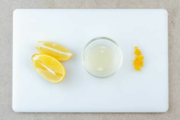 Die Zitronenschale abreiben und die Zitrone halbieren, dann eine Hälfte auspressen und die andere Hälfte in Spalten schneiden.