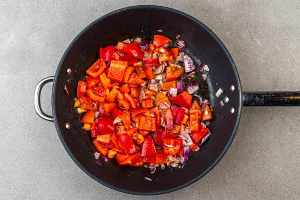 In einem mittelgroßen Topf 800ml leicht gesalzenes Wasser für den Reis zum Kochen bringen. Die Paprika halbieren, entkernen und in grobe Würfel schneiden. Die Zwiebeln schälen, halbieren und grob würfeln. Den Knoblauch schälen und in feine Scheibchen schneiden. Die Tomaten grob würfeln.