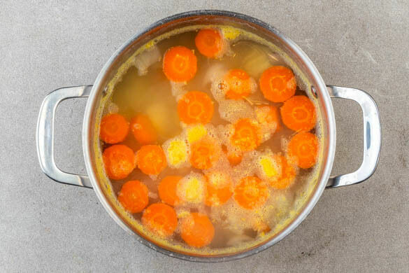 Den Backofen auf 240°C (220°C Umluft) vorheizen. In einem großen Topf reichlich gesalzenes Wasser zum Kochen bringen. Die Kartoffeln schälen und in ca. 2cm große Würfel schneiden. Die Karotten ggf. schälen und in ca. 2cm breite Scheiben schneiden. Die Zwiebeln schälen, halbieren und grob würfeln. Das Gemüse in das kochende Wasser geben und in 20–25Min. gar kochen.