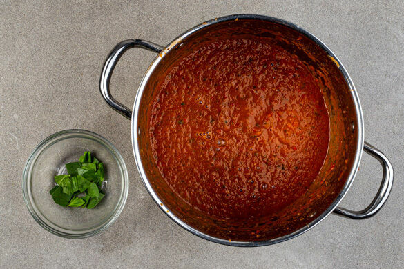 Die Basilikumblätter von den Stängeln zupfen und grob schneiden, dann die ½ des Basilikums in den Topf zu der Paprika geben und alles fein pürieren, dabei ggf. etwas Wasser hinzufügen. Die Paprikasuppe mit Salz, Zucker und Essig abschmecken und auf tiefe Teller verteilen. Mit dem übrigen Basilikum garnieren und mit der Konfitüre und dem Toast servieren.