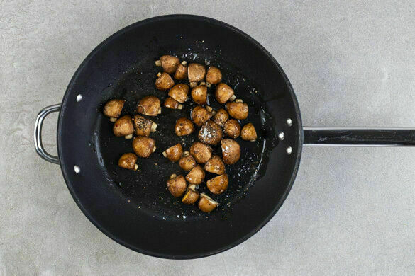 Die Pilze in einer großen Pfanne mit 2EL Olivenöl bei starker Hitze 4–5Min. ohne Rühren scharf anbraten. Mit 1 Prise Salz würzen und bei mittlerer Hitze 2–3Min. weiter braten, bis das ausgetretene Wasser verdunstet ist. Die Pilze mit Salz und Pfeffer abschmecken.