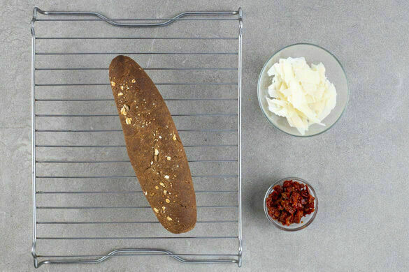 Die Brötchen auf einem Backrost 4–5Min. im Ofen aufbacken, anschließend etwas abkühlen lassen. Den Käse mit einem Sparschäler in breite Streifen schneiden. Die getrockneten Tomaten in kleine Stücke schneiden.