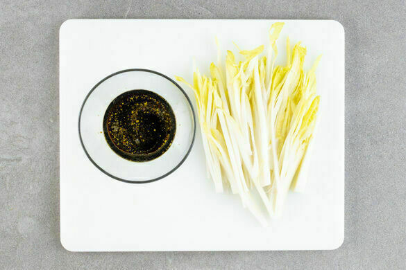 Den Chicorée längs halbieren, dann der Länge nach in feine Streifen schneiden. 2EL Olivenöl mit 1EL Essig sowie je 1 kräftigen Prise Salz und Pfeffer verrühren und den Chicorée untermengen.