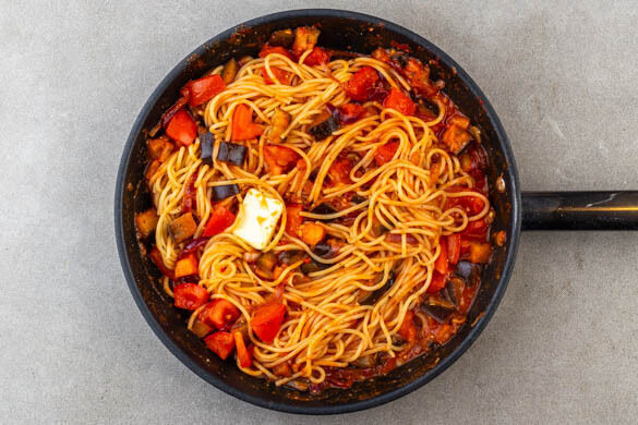 Das Miso unter die Gemüsesauce rühren und ca. 1Min. köcheln lassen. Die Pasta, 2–4EL Pastawasser und 2EL vegane Margarine unterheben und vermengen, bis die gesamte Pasta mit Sauce überzogen ist. Mit Salz und Pfeffer abschmecken. Die Pasta mit der Gemüsesauce und den Hackbällchen anrichten und mit dem Reibe-Topping bestreut servieren.