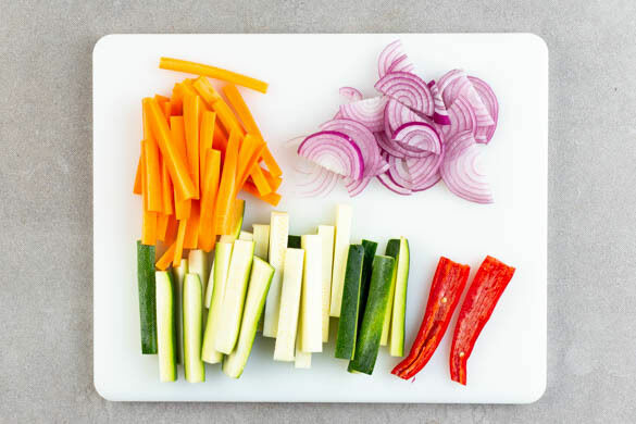 Den Backofen auf 240°C (220°C Umluft) vorheizen. Die Karotte ggf. schälen und mit der Zucchini in ca. 1cm breite Stifte schneiden. Die Zwiebel schälen, halbieren und in dünne Streifen schneiden. Die Chilischote halbieren und für weniger Schärfe ggf. entkernen.