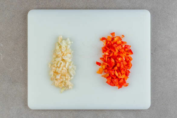 Die Zwiebeln schälen, halbieren und fein würfeln. Die Paprika vierteln, entkernen und in kleine Würfel schneiden.