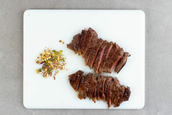 Die Pistazien grob hacken. Das Fleisch in Tranchen schneiden. Die Fetacreme auf Teller verteilen und mit der ½ der Kräutersauce beträufeln. Das Ofengemüse und das Fleisch darauf anrichten. Mit den Pistazien, den Oliven und der restlichen Kräutersauce garnieren. Die Brötchen in Scheiben schneiden und dazu servieren.