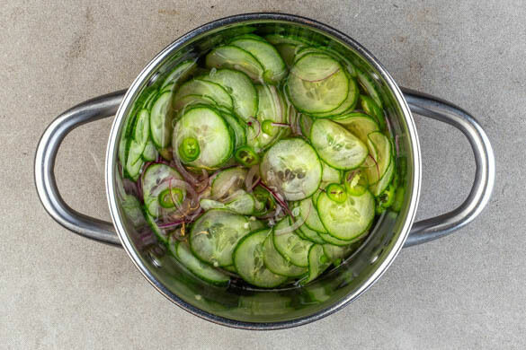 Die Zwiebeln schälen, halbieren und in feine Streifen schneiden. Die Gurke und die Chilischoten in dünne Scheiben schneiden. 200ml Wasser, 200ml Essig, 1EL Zucker und 1EL Salz in einem mittelgroßen Topf zum Kochen bringen. Vom Herd nehmen, das Gemüse in den Topf geben und mit der Flüssigkeit bedecken, ggf. eine Lage Küchenkrepp darauflegen. Bis zum Servieren beiseitestellen.