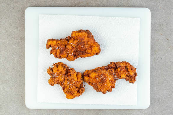 Das Fleisch gut in dem gewürzten Mehl aus Schritt 1 wenden und portionsweise im heißen Öl von beiden Seiten in 5–6Min. goldbraun und knusprig ausbacken. Mit Salz würzen und auf einem Backrost oder Küchenkrepp abtropfen lassen. Tipp: Alternativ kann das Fleisch vor dem Backen der Waffeln gegart und im 100°C warmen Backofen warmgehalten werden.