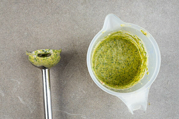Den Koriander und das Basilikum samt Stängeln grob schneiden. Den Knoblauch schälen. Das weiche Kerngehäuse der übrigen Tomatenspalten entfernen, dann die Tomaten ebenfalls grob zerkleinern. Die Kräuter, den Knoblauch, die Tomaten und 2EL vegane Mayonnaise in einem hohen Gefäß mit einem Stabmixer cremig pürieren. Den Dip mit Salz und Pfeffer abschmecken.