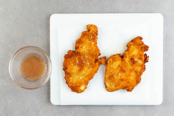 Eine große Pfanne ca. 1cm hoch mit Pflanzenöl befüllen und auf mittlerer Stufe erwärmen. Die Schnitzel im heißen Öl auf jeder Seite ca. 2Min. goldbraun braten, anschließend auf etwas Küchenpapier abtropfen lassen. Währenddessen aus 3EL Pflanzenöl, 3EL Essig, 1TL Salz und je ½TL Pfeffer und Zucker ein Dressing anrühren.