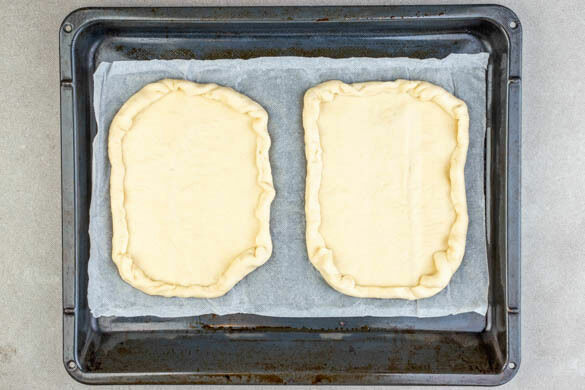 Die Teige mit dem Papier nach unten auf zwei Backblechen ausrollen und jeweils halbieren. Die Teigränder ca. 1cm einrollen und den Teig zu leicht ovalen Stücken formen. Die Enden gut zusammendrücken.