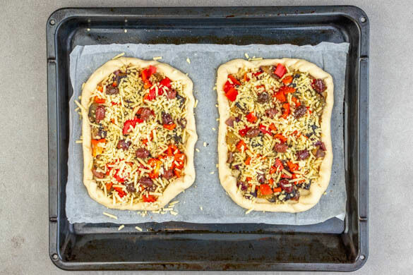 Die Auberginen-Mischung auf dem Teig verstreichen, dabei die Ränder auslassen. Dann die Paprika, die Oliven und das vegane Reibe-Topping obendrauf verteilen und die Pide mit je 1 kräftigen Prise Salz und Pfeffer würzen.