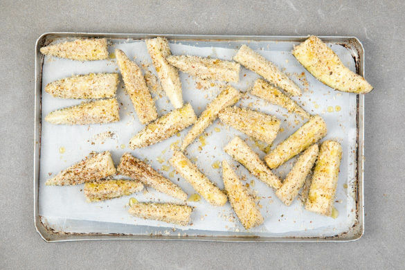 Die Auberginen in einem Sieb mit kaltem Wasser abspülen und abtropfen lassen. Das Panko-Paniermehl mit der Gewürzmischung und 1TL Salz vermengen und die Auberginen rundum damit panieren. Auf das mit Backpapier belegte Backblech geben, mit 2EL Olivenöl beträufeln und in 20–25Min. im Ofen knusprig backen.