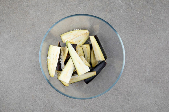 Den Backofen auf 200°C Umluft (220°C Ober-/Unterhitze) vorheizen. Die Auberginen längs halbieren und die Hälften nochmals vierteln, dann jedes Viertel einmal quer halbieren. Die Auberginenstücke mit 2TL Salz vermengen und ca. 5Min. ziehen lassen. Dadurch werden Bitterstoffe entzogen.