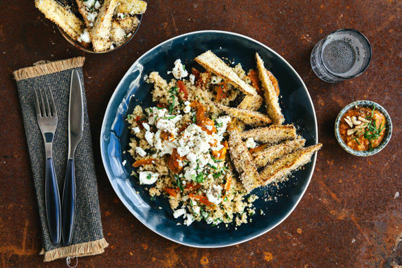 In einer knusprig gebackenen Panko-Gewürz-Panade ist die Aubergine einfach unwiderstehlich! Dazu gibt es einen fruchtigen Couscoussalat mit getrockneten Aprikosen und frischer Petersilie, köstlich-salzigen Feta und eine aromatische Romescosauce aus gerösteter Paprika und Haselnüssen. Guten Appetit!