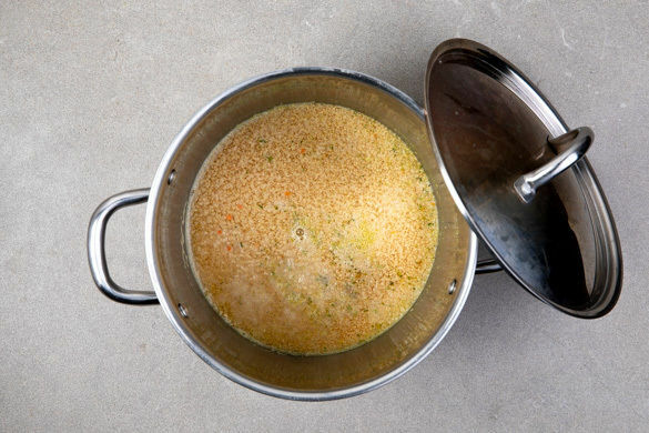 In einem kleinen Topf 300ml Wasser mit der ½ des Brühgewürzes zum Kochen bringen. Den Topf vom Herd nehmen, den Couscous in die heiße Brühe rühren und abgedeckt ohne Hitzezufuhr 8–10Min. ziehen lassen, bis der Couscous das gesamte Wasser aufgesogen hat und gar ist.