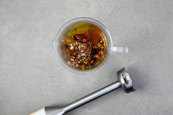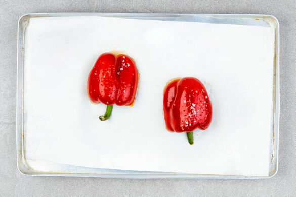 Die Paprika halbieren, entkernen und mit 1EL Olivenöl sowie etwas Salz einreiben. Mit der Schnittseite nach unten auf ein mit Backpapier belegtes Backblech geben und im Ofen auf der obersten Schiene 15–20Min. rösten, bis die Haut anfängt, Blasen zu werfen. Die Paprika leicht abkühlen lassen, dann vorsichtig die Haut entfernen.