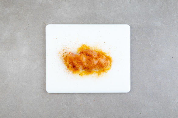 Das Fleisch mit etwas Küchenkrepp trocken tupfen und mit der 1/2 der Gewürzmischung sowie 1EL Pflanzenöl einreiben.
