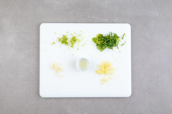 Die Limettenschale abreiben, dann die Limetten halbieren und auspressen. Den Ingwer schälen und in möglichst feine Würfel schneiden. Den Knoblauch schälen und fein hacken.