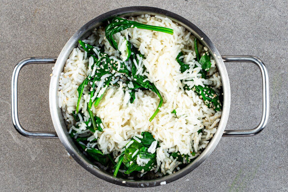 In einem mittelgroßen Topf 600ml leicht gesalzenes Wasser zum Kochen bringen. Den Reis in einem Sieb kalt abspülen, bis das Wasser klar bleibt. Sobald das Wasser kocht, den Reis hineingeben und abgedeckt bei niedrigster Hitze 12–14Min. kochen, bis das Wasser aufgesogen und der Reis gar ist. Noch ca. 5Min. ohne Hitzezufuhr ziehen lassen.