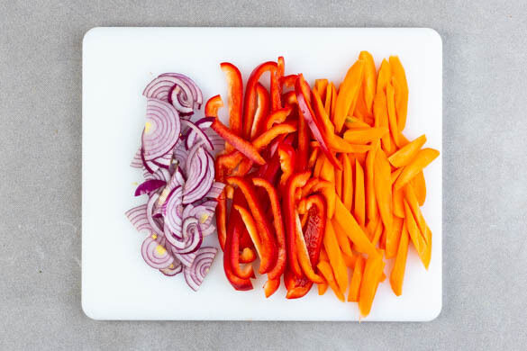 Inzwischen die Paprika vierteln, entkernen und in dünne Streifen schneiden. Die Karotte ggf. schälen, der Länge nach halbieren und schräg in dünne Scheiben schneiden. Die Zwiebel schälen, halbieren und in feine Streifen schneiden.