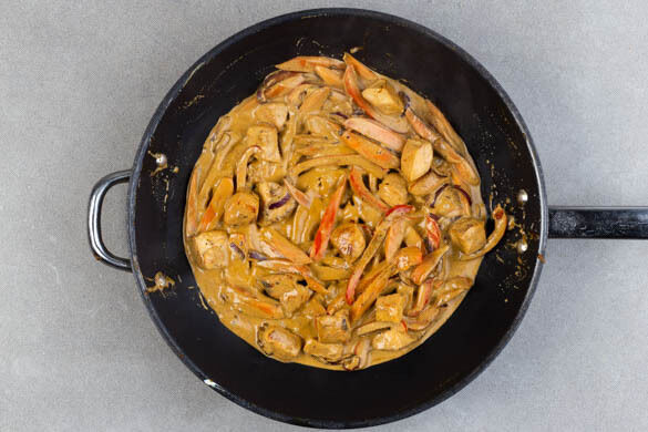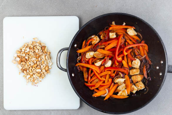 Das Fleisch in einer großen Pfanne mit 1EL Pflanzenöl bei starker Hitze 2–3Min. scharf anbraten. Die Paprika, die Karotten und die Zwiebeln hinzugeben und 3–4Min. mitbraten. Inzwischen die Erdnüsse grob hacken.