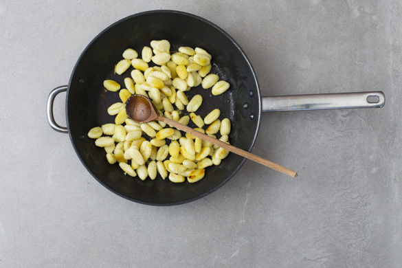 Inzwischen die Gnocchi in einer großen Pfanne mit 1EL Olivenöl bei mittlerer Hitze 6–8Min. goldbraun anbraten. Mit je 1 Prise Salz und Pfeffer würzen und die Pfanne vom Herd nehmen.