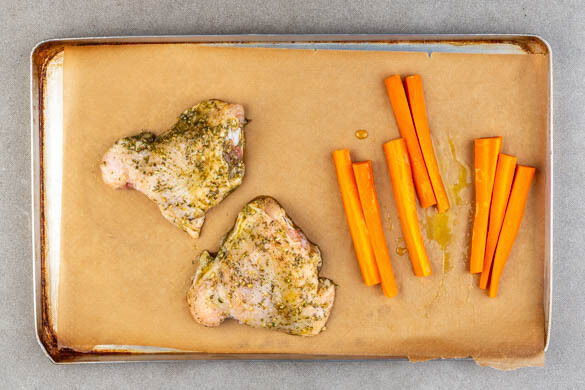 Das Fleisch trocken tupfen, auf ein Backblech legen, rundum mit 1EL Olivenöl, der Gewürzmischung, 1TL Salz und 1 kräftigen Prise Pfeffer würzen und mit der Hautseite nach unten legen. Die Karotten ggf. schälen, längs vierteln, in Stifte schneiden und mit 2TL Olivenöl, 2TL Honig und 1 Prise Salz einreiben. Das Fleisch und die Karotten im Ofen ca. 15min. backen.