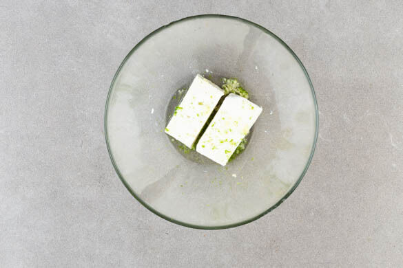 Den Ofen mit Grillfunktion oder Ober-/Unterhitze auf 250°C vorheizen. Die Limettenschale abreiben. Den Knoblauch schälen und durch eine Knoblauchpresse drücken oder sehr fein würfeln, dann mit der Limettenschale und ½EL Olivenöl in einer Schüssel zu einem Würzöl verrühren. Den Feta in der Schüssel mit dem Würzöl vermengen und beiseitestellen.
