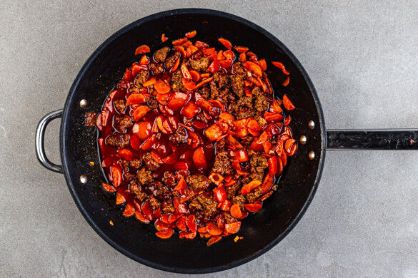 Die Chilipaste und die Sojasauce unterrühren und alles bei mittlerer Hitze weitere 4–5Min. köcheln lassen. Ggf. 1–2EL Wasser zugeben, falls die Hackpfanne zu trocken wirkt. Wenn das Hackfleisch gar ist, 1EL Einlegesud sowie 1 kräftige Prise Zucker einrühren und die Hackpfanne mit Salz und Pfeffer abschmecken.