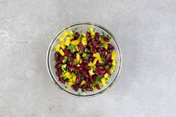 Die fertigen Quesadillas mit einem scharfen Messer in Viertel schneiden, mit dem Bohnensalat und der Salsa anrichten und servieren. Tipp: Sollte Füllung übrig bleiben, kann diese zum Frühstück mit 2–3 Eiern verquirlt als leckeres Omelett zubereitet werden.