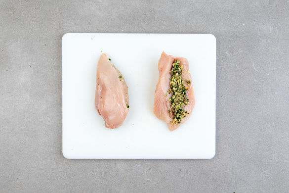 Den Backofen auf 180°C Umluft (200°C Ober-/Unterhitze) vorheizen. Das Fleisch mit etwas Küchenkrepp trocken tupfen und der Länge nach bis zur Hälfte einschneiden, sodass eine Tasche entsteht.