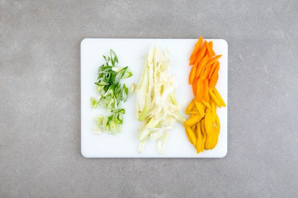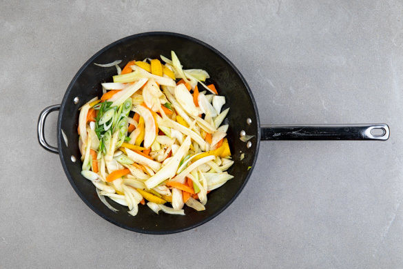 Die Lauchzwiebeln schräg in feine Ringe schneiden. Die Karotten schälen, längs halbieren und schräg in feine Streifen schneiden. Den Fenchel halbieren, den Strunk herausschneiden und in sehr feine Streifen schneiden.