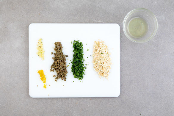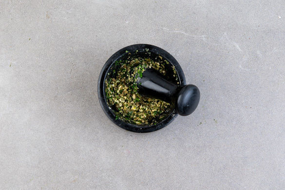 Die Petersilie, die Cashews, die Kapern, den Knoblauch und den Zitronenabrieb mit 2EL Olivenöl in einem Mörser zerstoßen und die Gremolata mit Salz und Pfeffer abschmecken.