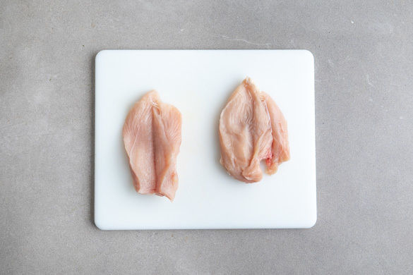 Den Backofen auf 180°C Umluft (200°C Ober-/Unterhitze) vorheizen. Das Fleisch mit etwas Küchenkrepp trocken tupfen und der Länge nach bis zur Hälfte einschneiden, sodass eine Tasche entsteht.