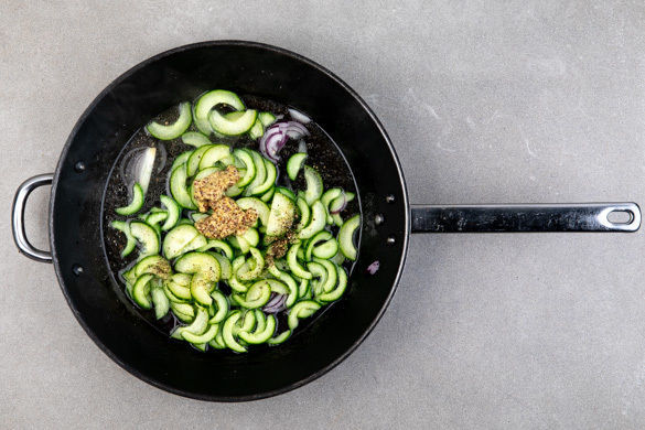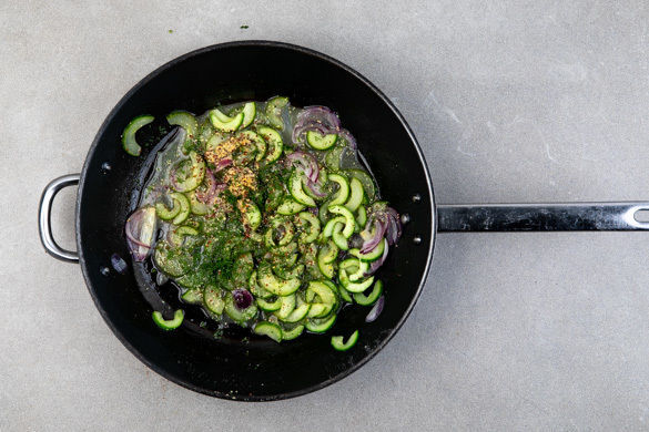 Die 1/2 der Zwiebeln und die Gurken in einer mittelgroßen Pfanne mit 1–2EL Olivenöl bei mittlerer Hitze 2–3Min. anbraten. Mit 100ml Wasser ablöschen, dann den Senf unterrühren. Noch kurz köcheln lassen, bis die Flüssigkeit verdampft ist und mit Salz und Pfeffer abschmecken.